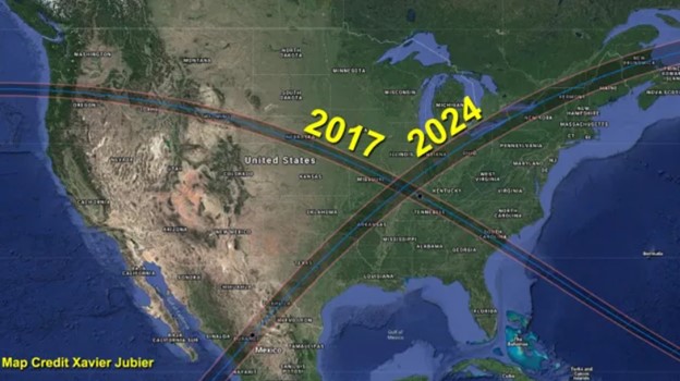 2024年4月8日是5784年正月初一,这是即将出现的日全食,和2017年出现的日全食在美国大陆形成一个X形,如下所示: