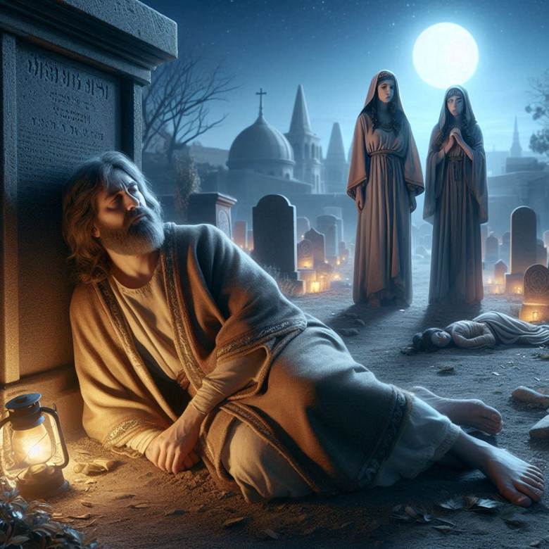 敬虔人的妻子问他,为什么去年所有人的庄稼都遭冰雹,而你的庄稼安然无恙,今年所有人的庄稼都遭风灾,你的庄稼又幸免于难?他就把整个事情告诉了她。他们接下来说,几天后,他的妻子和埋在那里的女子的母亲发生了争执,他的妻子羞辱她母亲说:让我带你去看你家的女儿,她埋葬在芦苇垫里。